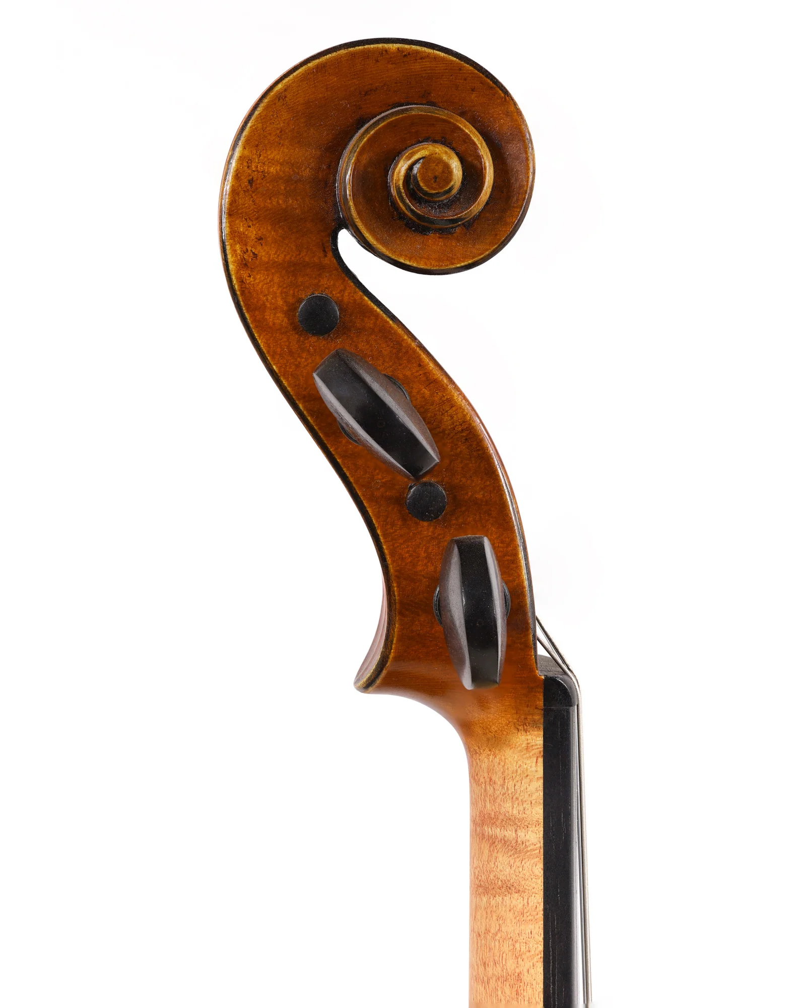 This violin is a clear mark of Tartariās influences and knowledge of the craft. The back is two pieces of quarter-cut maple with beautiful medium-narrow flame that slants slightly down from the center joint. The ribs and scroll match the back and is coated with a lovely orange brown varnish while the top is more antiqued and has been darkened to accentuate the prominent narrow grain of the spruce. The violin is heavily antiqued and shaded, revealing a pale golden ground. The scroll has some black outlining, and Tartariās craftsmanship shines through the elegant carving of the F-holes.