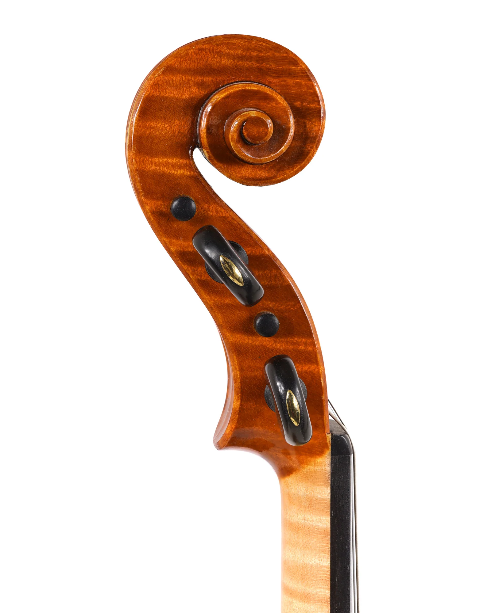 The varnish is a golden, honey color. The violin has a one-piece back with luminous figure slanting towards the bass side. The tone is beautiful, powerful, and clear. This violin would be great for orchestral playing!