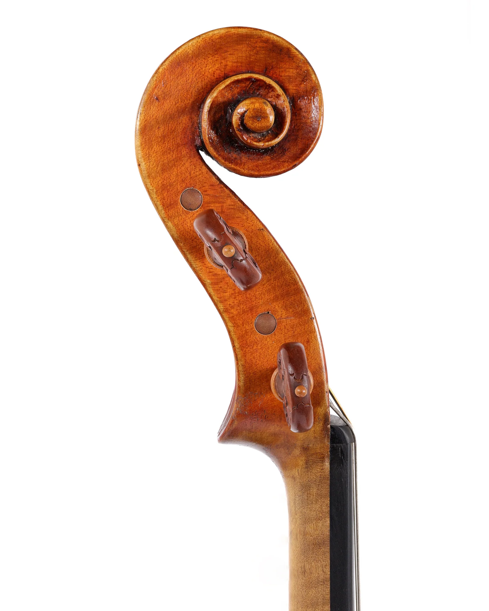 This viola is a joy to play—ideal for someone who is looking for a smaller instrument without sacrificing quality of tone and power. Its versatile enough for solo performances, and can also blend well in chamber groups or larger symphonies. This maker is known particularly for his excellent violas, which are sought out by violists everywhere for their consistency and versatility. This viola is made of well aged North American grown wood. The back is cut on the quarter from two pieces of maple with handsome medium width flames descending very slightly from center joint. The neck and ribs are of maple of narrower flame than that of the back. The table is of two pieces of Engelmann spruce from British Columbia of very narrow growth. There is a filled sap pocket on the bass side of the tailpiece. The varnish is of an orange-brown color and is shaded and imitated. The fittings are of boxwood with lighter trim. made of well aged North American grown wood. The back is cut on the quarter from two pieces of maple with handsome medium width flames descending very slightly from center joint. The neck and ribs are of maple of narrower flame than that of the back. The table is of two pieces of Engelmann spruce from British Columbia of very narrow growth. There is a filled sap pocket on the bass side of the tailpiece. The varnish is of an orange-brown color and is shaded and imitated. The fittings are of boxwood with lighter trim.