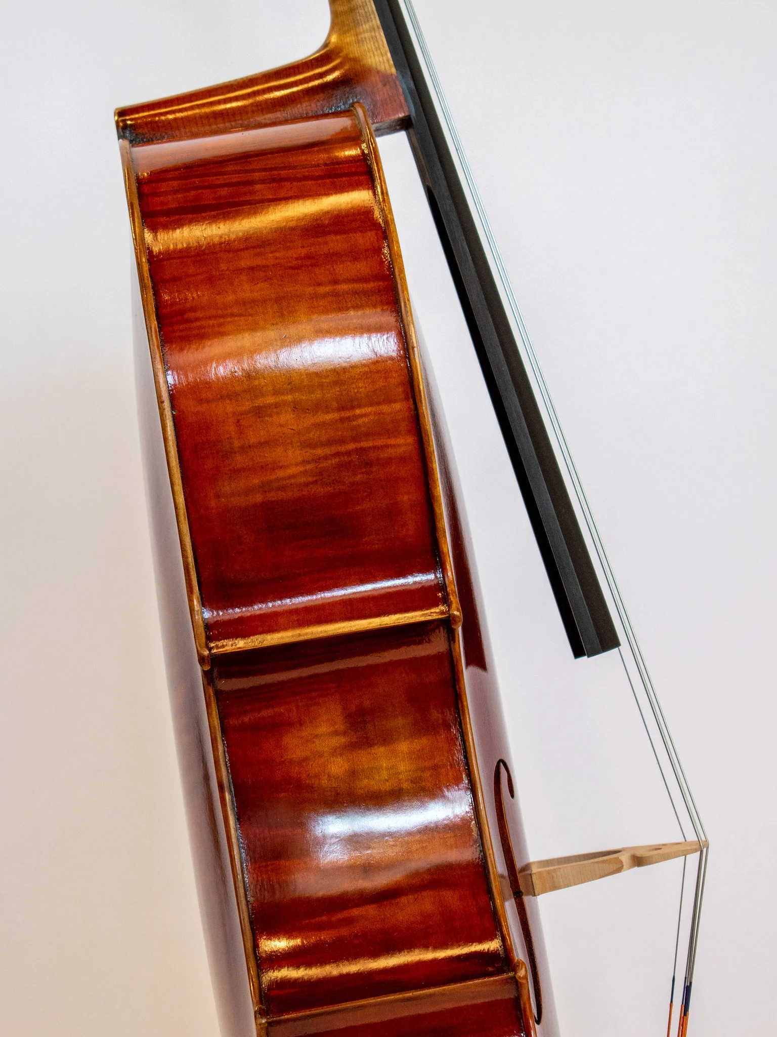 These cellos feature a striking flamed maple back, deep red-brown varnish with beautifully shaded gold spots, and a tone that is powerful, clear, and full.